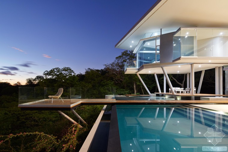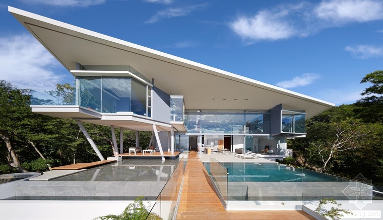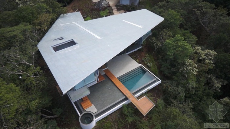 Indios Desnudos 别墅在加约半岛,位处于朝海的一个尖端处,略向下倾斜的半岛形山脊,两边有森林(其中一个是自然?;で?。这个名字来自于场地里最有特点的一些树:indio desnudo(赤裸的印第安人),它们组成了别墅的一个焦点,特别在居住区。别墅的设计旨在让人享受室外生活和视野。因此,它被设计成在没有空调的条件下仍然能舒适生活的建筑。室内空间与室外空间相整合,在室内的同时感觉像在室外。所有的居住空间都有通向大海或是森林?;で氖右?。它有其主要的通向大堂的通道,你可以通过它看到社交区和大海。从这里你可以使用像木栈道一样的走道,悬在分散的河石上,组成了流线的两条轴线,组成楼层平面图,或者使用楼梯通过桥梁到达两个主卧室。