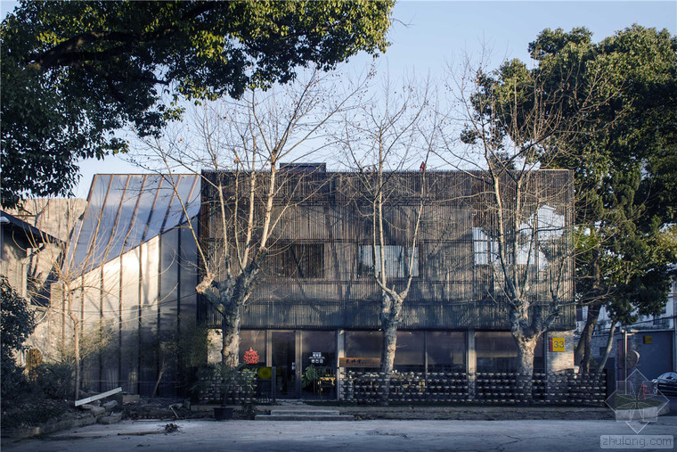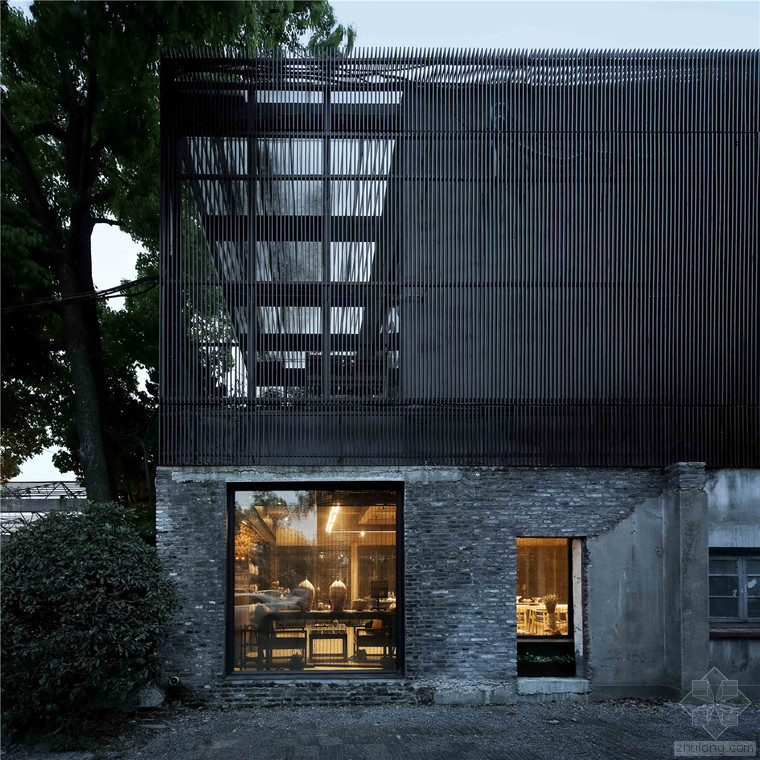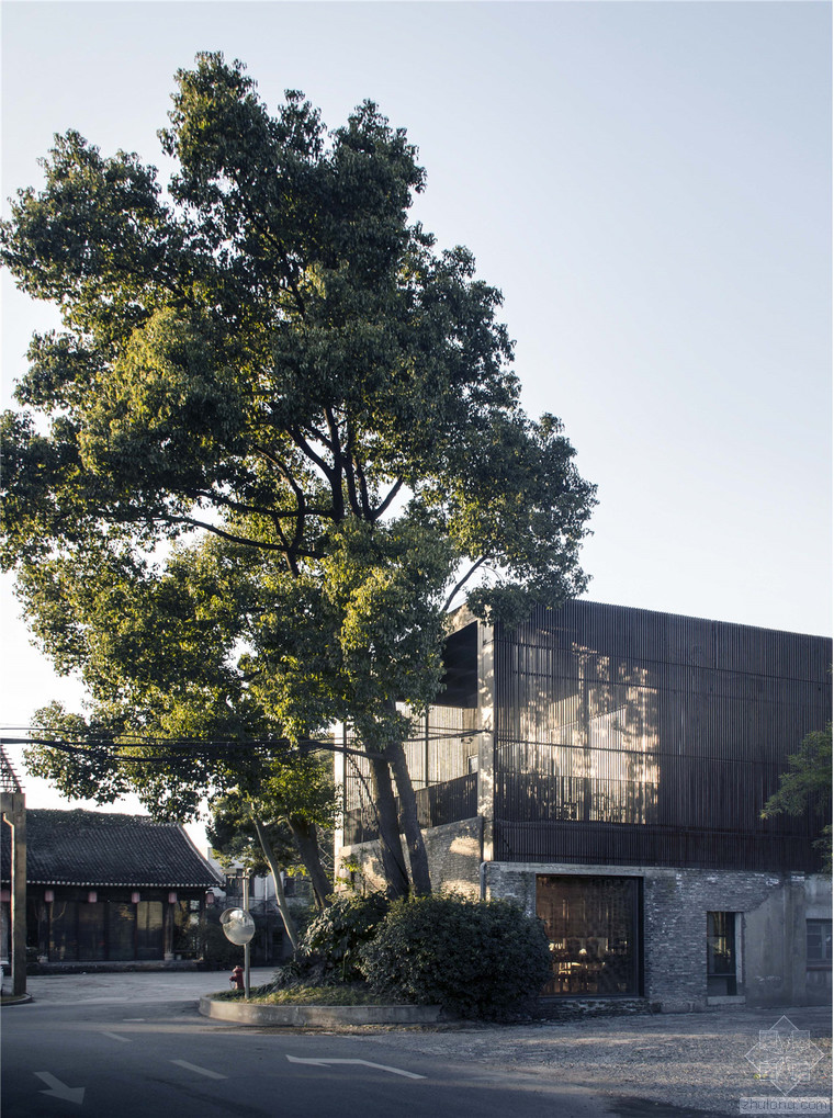 瓷语堂项目是对建筑原真性的一次回归,我们希望通过一个最简单的手段介入场地,使得建筑物仅仅作为一个“存在”与基地发生关系,而不是通过美学加以评判。在面对场地现状已经存在的几栋老建筑和一棵大树,我们希望它们可以成为场地记忆的再现,作为新建筑的一部分共同留存下去,而不是简单的粗暴拆除并由一个全新的物体所替代。通过合理的结构布置和构造处理,新房子轻巧的微微落于老墙之上,二者完整的融合在了一起,斑驳的老墙和由砖、木等朴素材料构筑的新建筑自然而然的和谐共生,而老墙的岁月留下的痕迹亦为建筑提供了不可复制的特征。场地上的大树成为了我们南侧的重要遮蔽,使得二层的露台不会直接暴露在正对的一条小路前面,同时也为露台贡献了不同季节的多样风景和光影特质。作为陶瓷艺术家展示、交流和工作的场所,空间的布置简洁而不失特点,混凝土、青砖等朴素而带有一点点粗糙质感的材料与陶瓷艺术品相映成趣,建筑低调地成为了作品的背景。