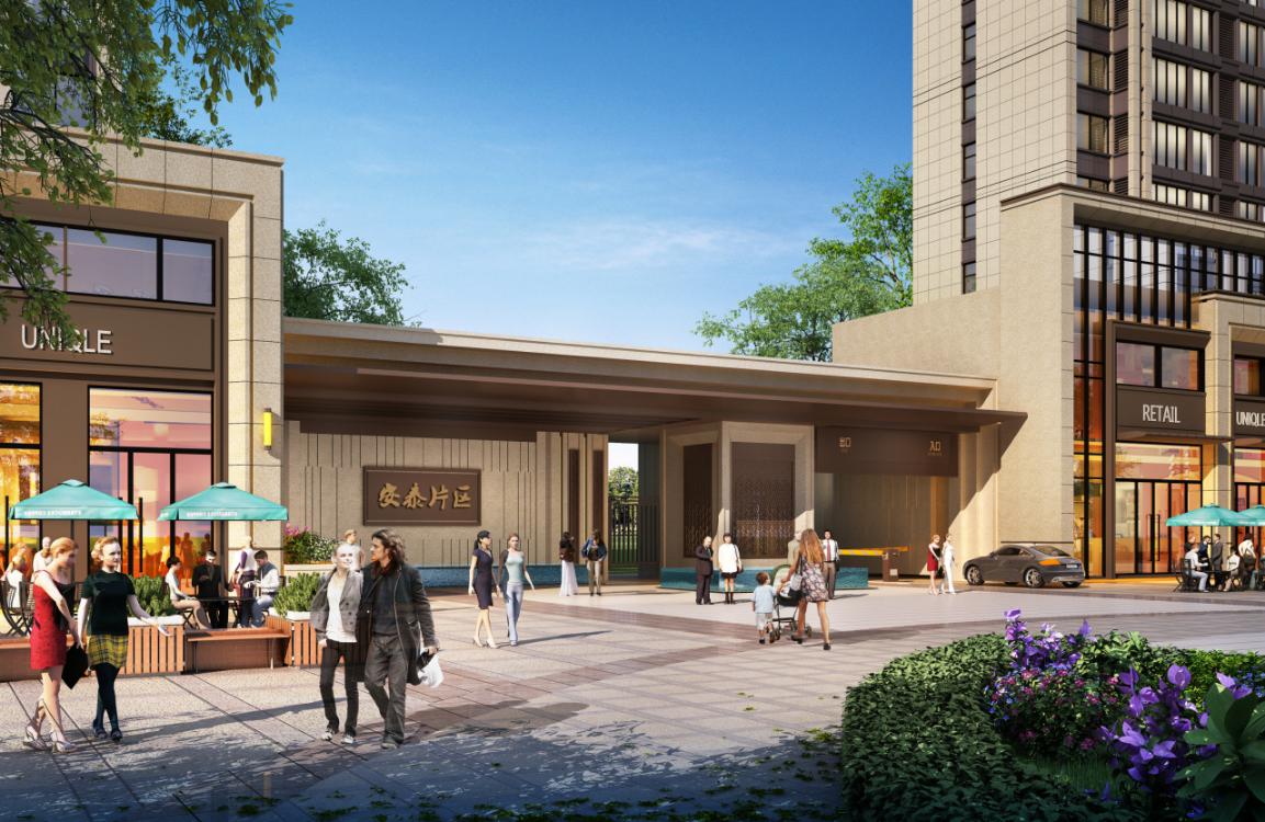 本案采用现代建筑风格,以具有浓厚地域特色的传统文化为根基,融入西方文化,把亚洲元素植入到现代建筑语系,将传统意境和现代风格对称运用,用现代设计来隐喻中国传统。结合周边建筑的特点,设计为整体稍偏暖色调,外立面采用米黄色真石漆,没有复杂体量的堆砌,只是在简单的体量上凭借精致构件加以点缀。强调面的实体作用和玻璃的虚化作用,形成对比。商业体块感更强一些,在心理感受上既给予人们质朴、亲切的感受,又结合了现代建筑洁净简单的特点。