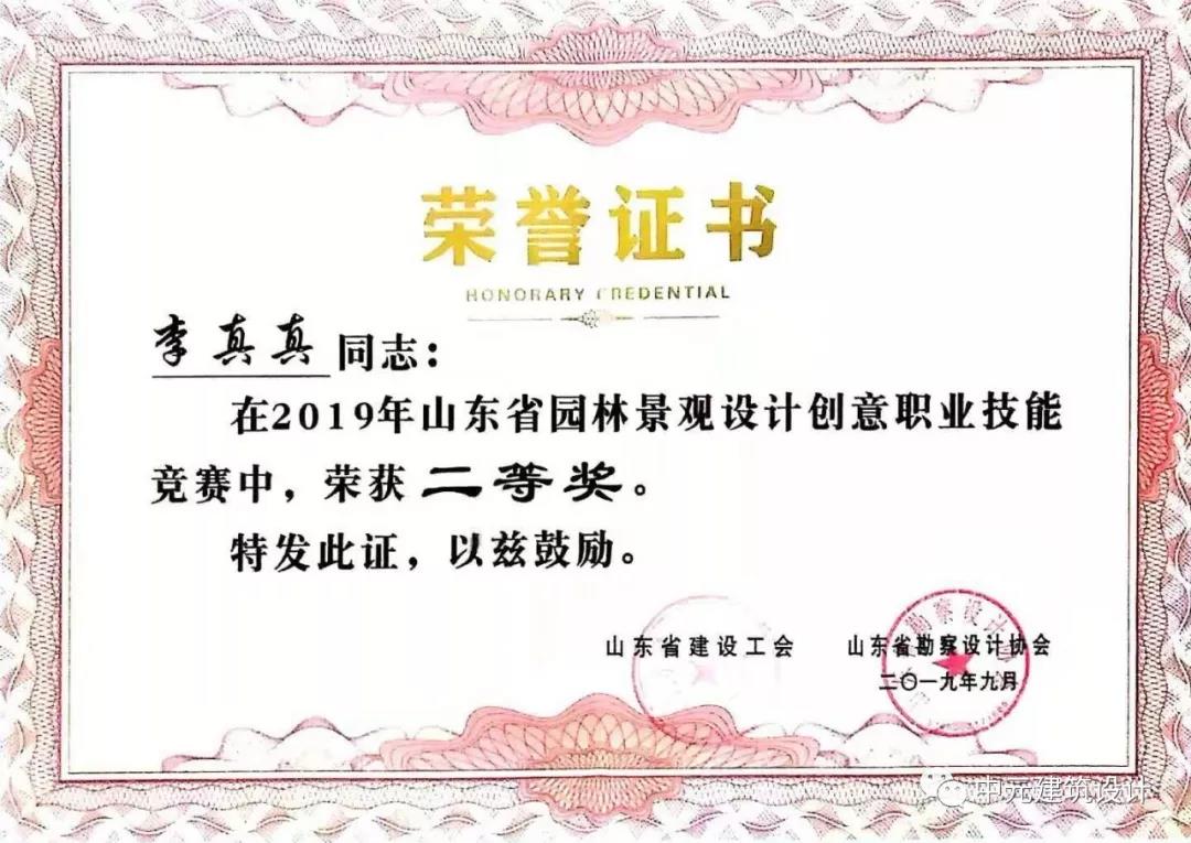 祝贺我公司李真真在2019年度山东省园林景观设计创意职业技能竞赛中获得全省二等奖的骄人战绩。为公司和个人赢得荣誉。